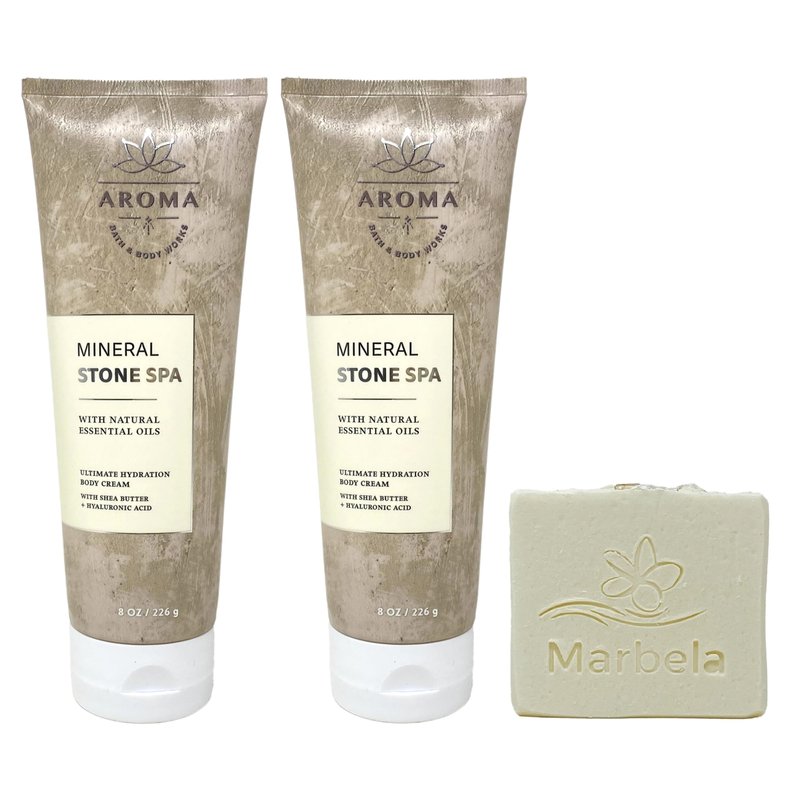 Bath & Body Works Aroma Mineral Stone Spa 2 Body Cream Set with a 4 oz Marbela Natural Oats Bar Soap. (Handmade, Vegan Friendly, Cruelty Free). Notes of: This soap is UNSCENTED in order to be sensitive skin friendly.