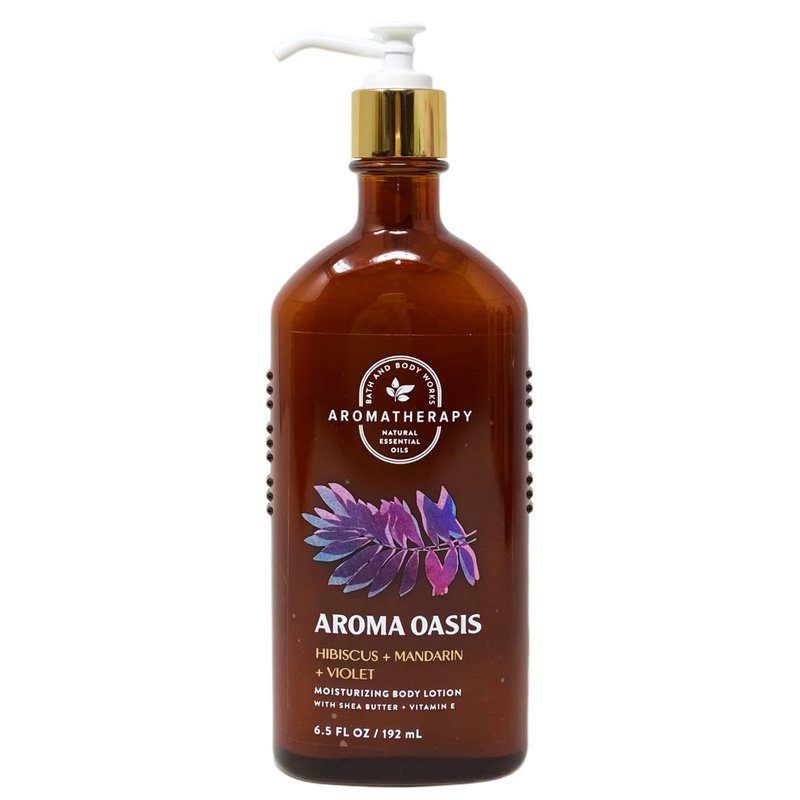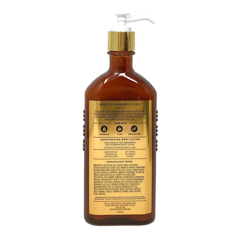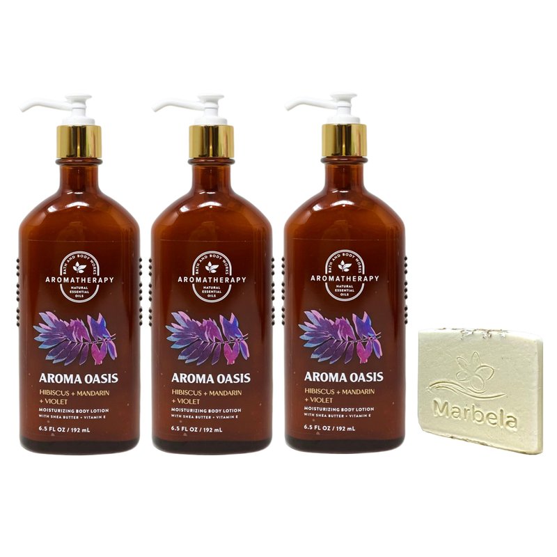 - Bath & Body Works Aroma Oasis Hibiscus Mandarin Violet Body Lotion Value Pack with a Marbela Natural Oats Sample Soap. (Soap May Vary).