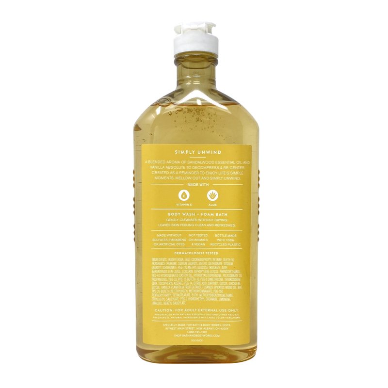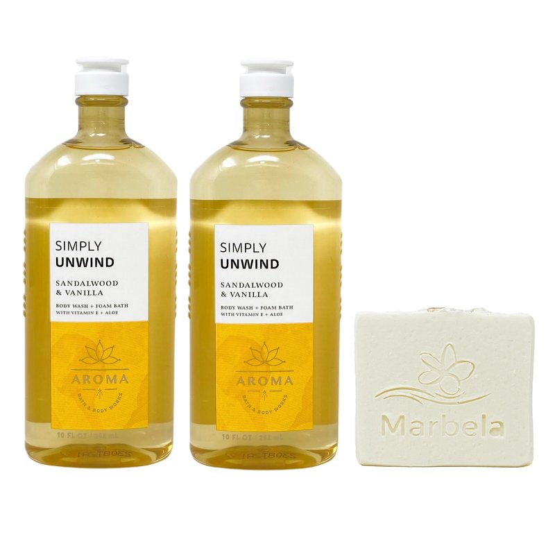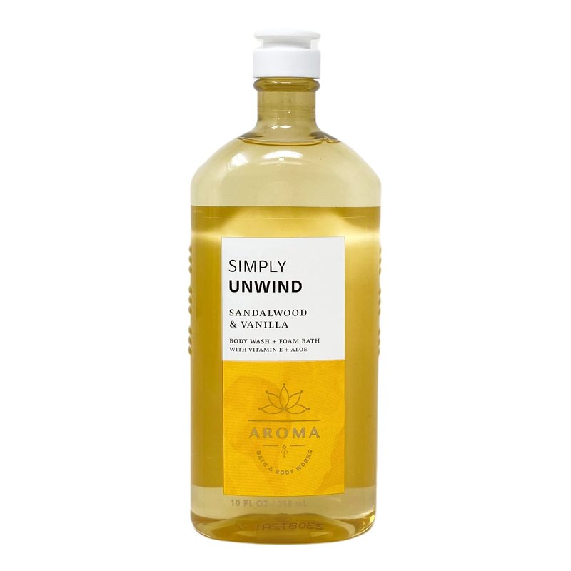 - Bath & Body Works Aroma Simply Unwind Sandalwood & Vanilla Body Wash + Foam Bath Bundle with a 4 oz Marbela Natural Oats Bar Soap. (Soap May Vary).