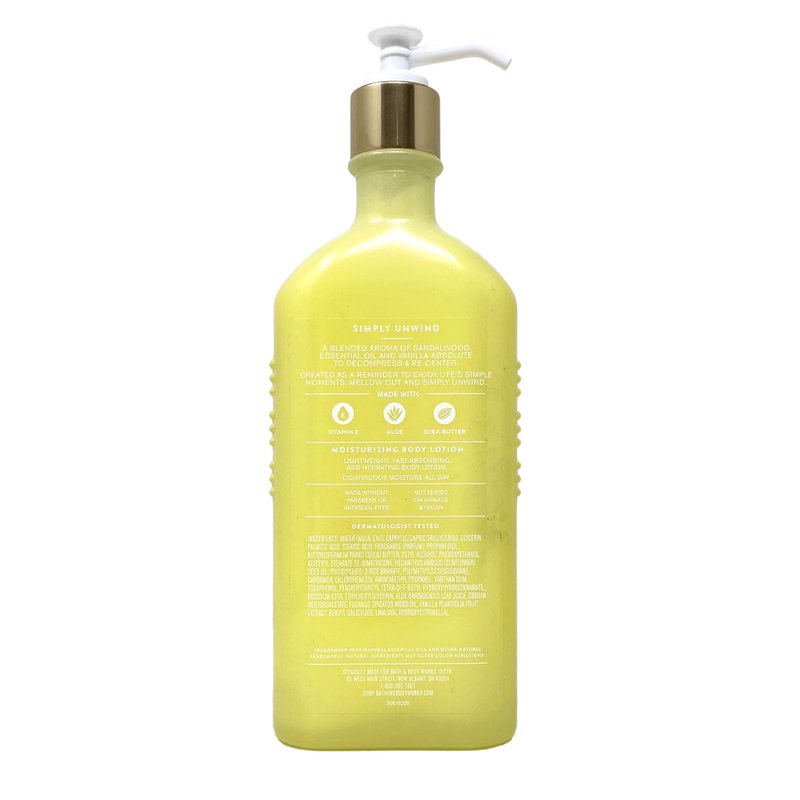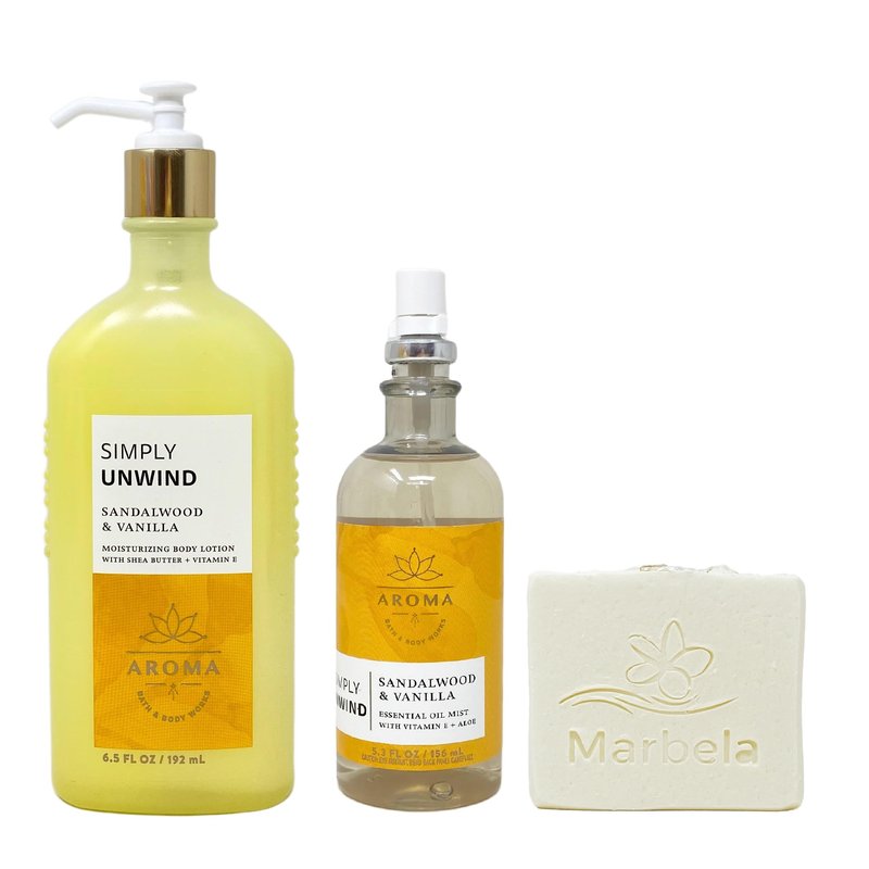 - Bath & Body Works Aroma Simply Unwind Sandalwood & Vanilla Value Pack with a 4 oz Marbela Natural Oats Bar Soap. (Soap May Vary).