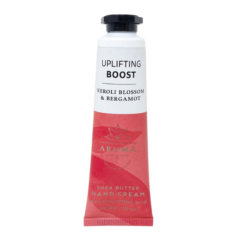 Bath & Body Works Aroma Uplifting Boost NEROLI BLOSSOM & BERGAOT Hand Cream - 1 fl oz / 29 mL. What it smells like: a bright, floral pick-me-up. Fragrance notes: neroli blossom and bergamot essential oils. What it does: leaves your hands feeling soft, smooth and nourished. Rich, luxurious texture absorbs quickly. Perfect for your bag, center console...or anywhere really.
