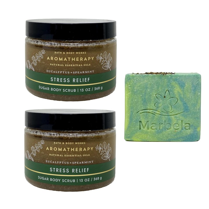 - Bath & Body Works Aromatherapy Eucalyptus + Spearmint Sugar Body Scrub Set with a Marbela Fresh Forest Bar Soap.