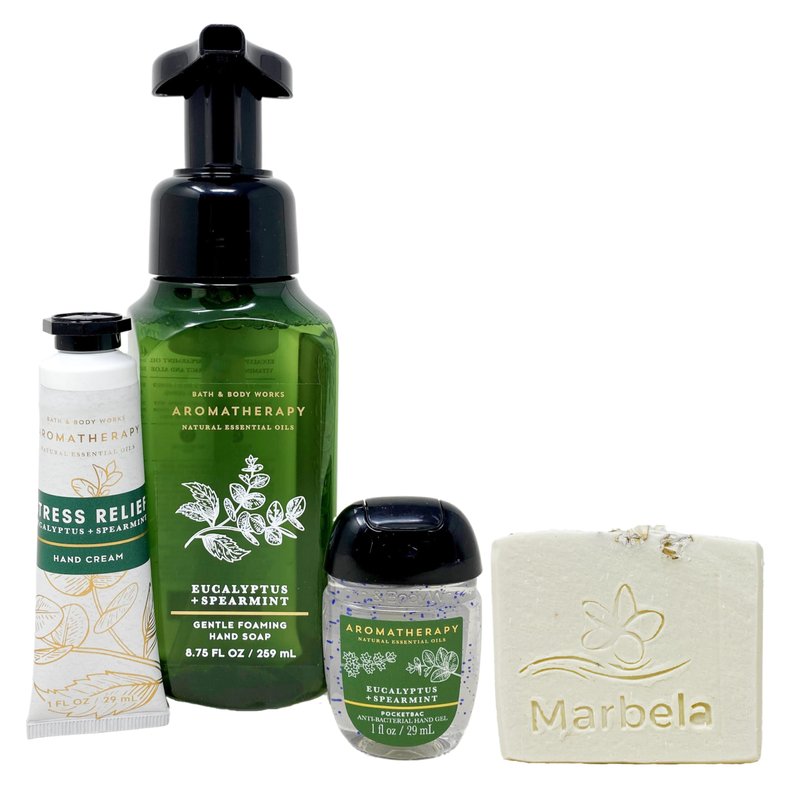 - Bath & Body Works Aromatherapy Eucalyptus Spearmint with a Marbela Natural Oats Sample Soap.(Marbela Sample Soap May Vary)