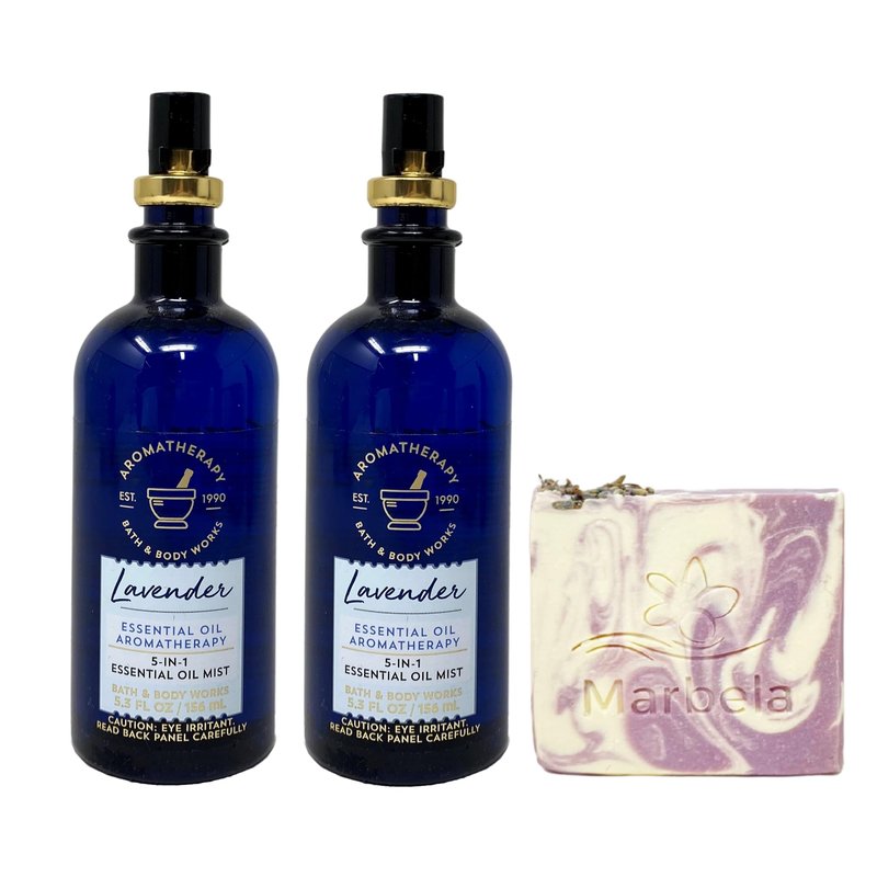 Bath & Body Works Aromatherapy Lavender 5-in-1 Essential Oil Mist Set with a Marbela Lavender Dream Bar Soap. INCLUDES: 2 5-in-1 Essential Oil Mists (5.3 fl oz / 156 mL each) and a 4 oz Marbela Lavender Dream Bar Soap. Lavender - Using an artisanal craft to extract essential oils from plants, this fragrance captures the natural therapeutic power of pure lavender. Marbela Lavender Dream Soap - Lavender Dreams is extra moisturizing, with added sweet almond oils to leave your skin as smooth as can be. Lavender flowers and essential oils are added to make Lavender Dream hydrating and relaxing; a natural stress-reducing moisture bomb for the sweetest dreams.