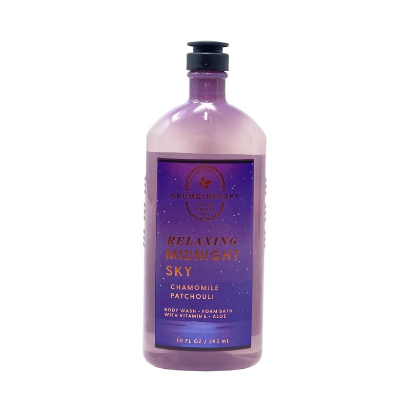 Bath & Body Works Aromatherapy Relaxing Midnight Sky CHAMOMILE PATCHOULI. INCLUDES: 6.5 fl oz / 192 mL Moisturizing Body Lotion, 10 fl oz / 295 mL Body Wash + Foam Bath and 5.3 fl oz / 156 mL Essential Oil Mist. Chamomile Patchouli - What it smells like: a relaxing midnight sky. Fragrance notes: chamomile and patchouli essential oils.