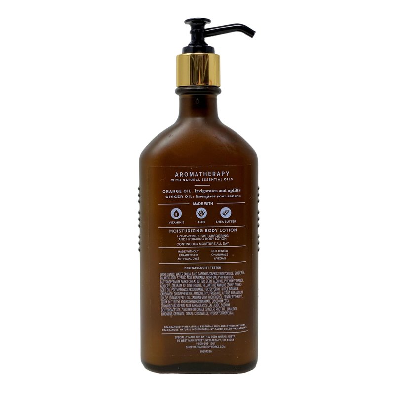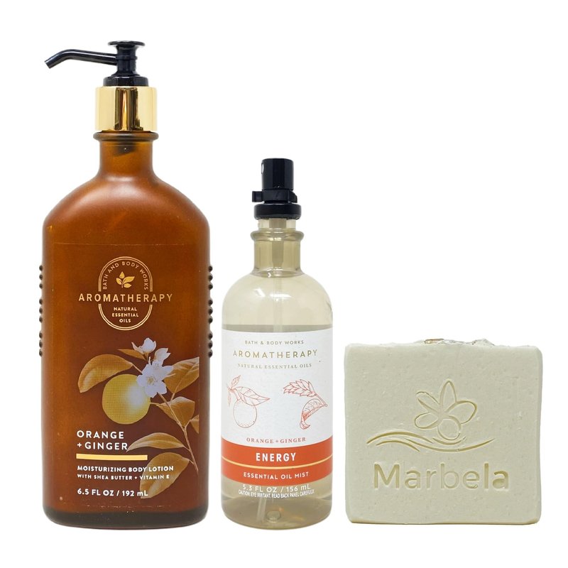 Bath & Body Works Aromatherapy Orange + Ginger 2 Piece Gift Set Bundle with a Marbela Natural Oats Bar Soap. INCLUDES: 6.5 fl oz / 192 mL Moisturizing Body Lotion, 5.3 fl oz / 156 mL Essential Oil Mist, and a 4 oz Marbela Natural Oats Bar Soap.INCLUDES: 6.5 fl oz / 192 mL Moisturizing Body Lotion, 5.3 fl oz / 156 mL Essential Oil Mist, and a 4 oz Marbela Natural Oats Bar Soap. Orange + Ginger - What it smells like: a fruity, spiced recharge. Fragrance notes: orange and ginger essential oils. Marbela Natural Oats Soap - Natural Oats is our most gentle formula for any skin type! Oats help to cleanse, exfoliate and soothe irritation. In addition, the sweet almond oil leaves skin soft and pampered. This soap was made for people with sensitive skin because we realize what a battle that can be. Notes of: This soap is UNSCENTED in order to be sensitive skin friendly.