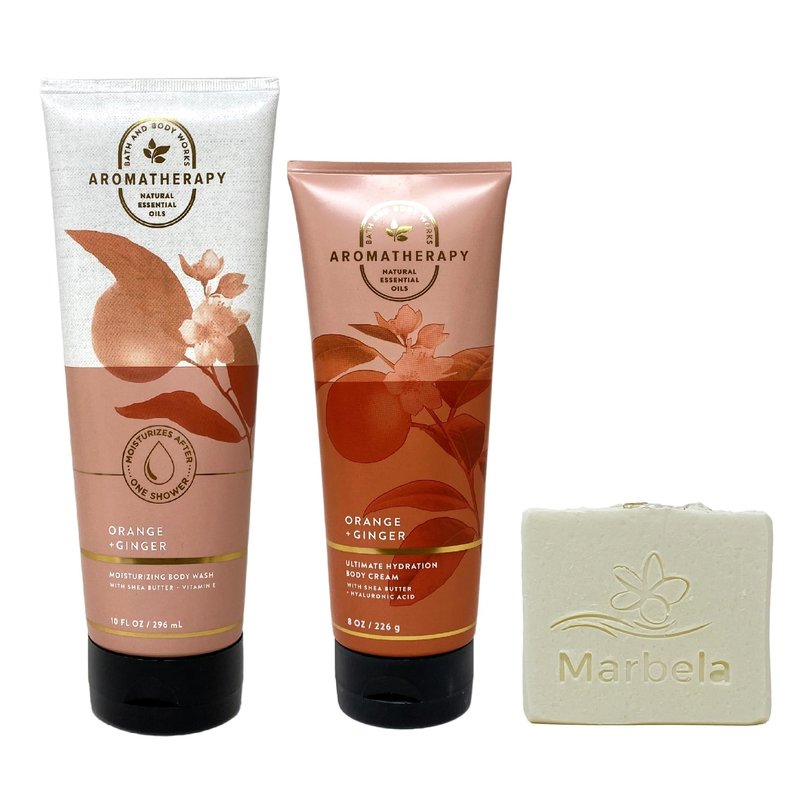 Bath & Body Works Aromatherapy Orange + Ginger 2 Piece Gift Set Bundle with a Marbela Natural Oats Bar Soap. INCLUDES: 10 fl oz / 295 mL Moisturizing Body Wash, 8 oz / 226 g Body Cream, and a 4 oz Marbela Natural Oats Bar Soap. Orange + Ginger - What it smells like: a fruity, spiced recharge. Fragrance notes: orange and ginger essential oils. Marbela Natural Oats Soap - Natural Oats is our most gentle formula for any skin type! Oats help to cleanse, exfoliate and soothe irritation. In addition, the sweet almond oil leaves skin soft and pampered. This soap was made for people with sensitive skin because we realize what a battle that can be. Notes of: This soap is UNSCENTED in order to be sensitive skin friendly.