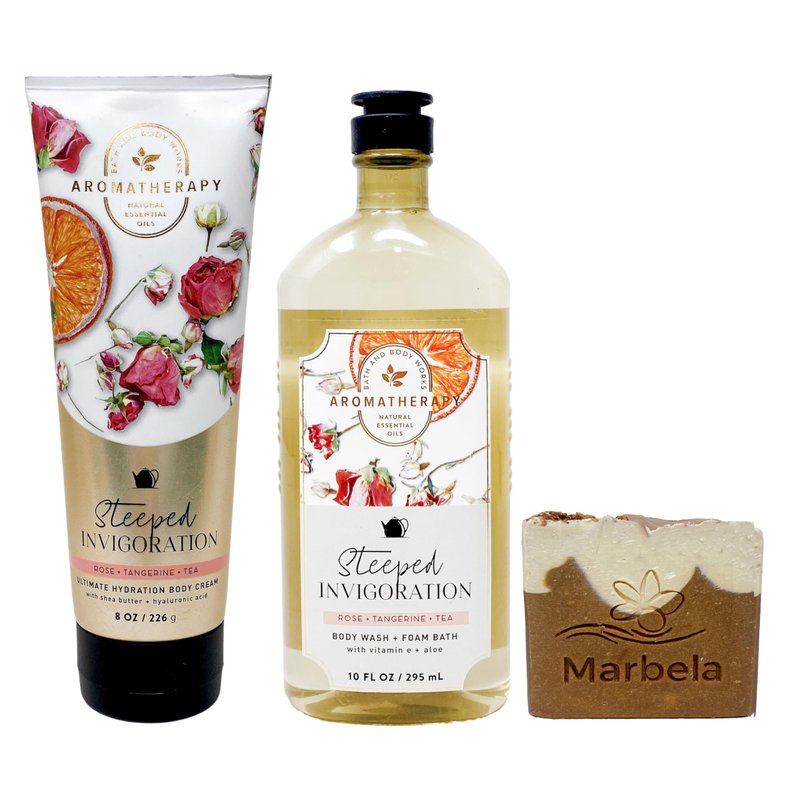 - Bath & Body Works Aromatherapy Steeped Invigoration Rose, Tangerine, Tea With a Marbela Yamma Jamma Bar Soap. (Marbela Soap May Vary)