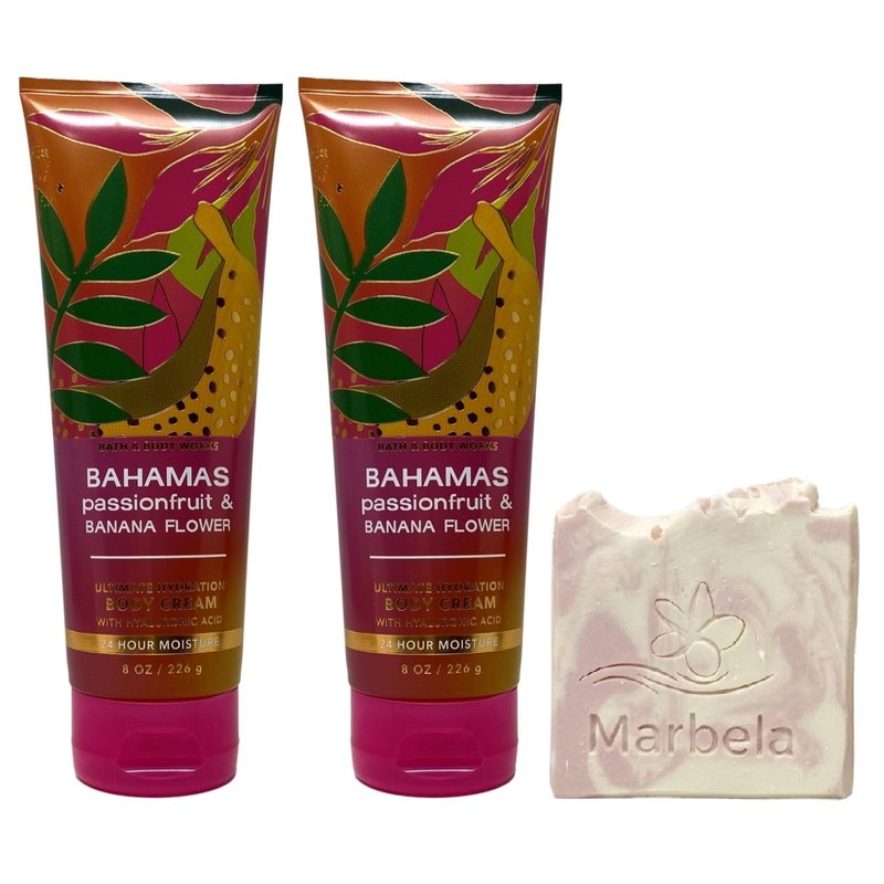 Bath & Body Works Bahamas Passionfruit & Banana Flower - 2 Pack Of Body Cream with a Himalayan Salts Springs Sample Bar Soap.