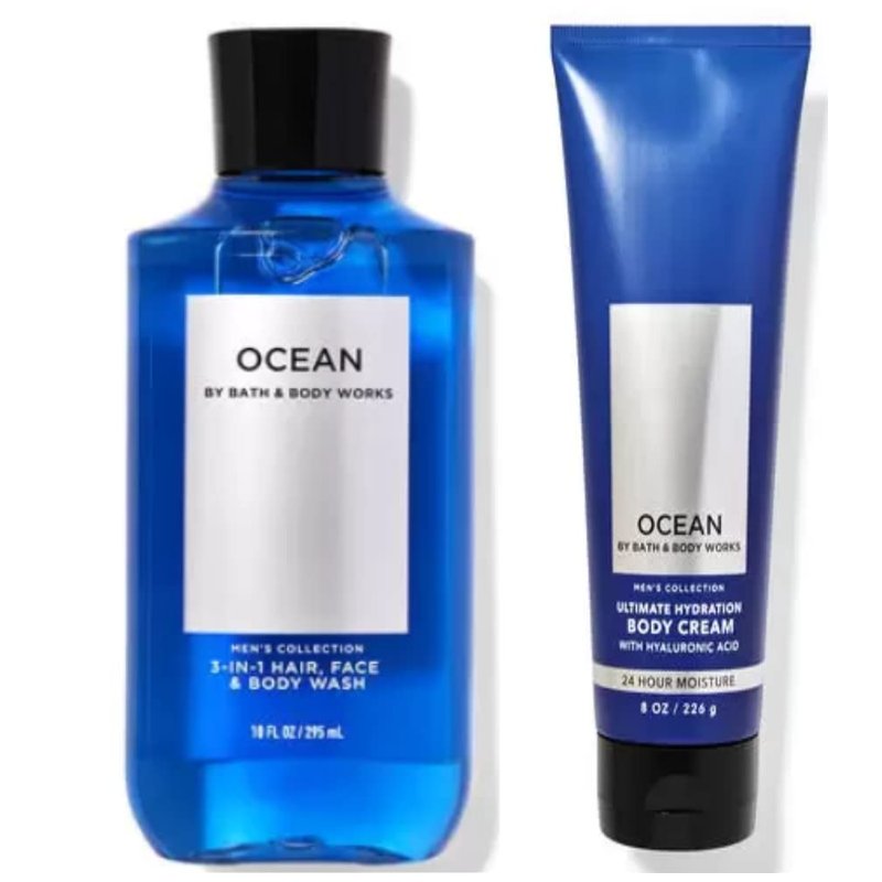 Bath and Body Works Ocean (2 Pack) Ultimate Hydration Body Cream 8 Oz. and Shower Gel 10 Oz. Scent: cypress, and coastal air.. Ingredients: (natural essential oils, vitamin E, aloe, shea butter, cocoa butter and hyaluronic acid), NO parabens or artificial dyes, Dermatologist tested, 82% recycled plastic. (Packaging may vary)