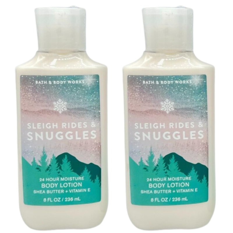 - Bath & Body Works Sleigh Rides & SnuggleFragrance: Snow Kissed Icicles, Fluffy Balsam & Vanilla BourbonIncludes two full-sized 8 oz bottles of lotionFortified with nutrient-rich ingredients like protective Vitamin E and conditioning Vitamin B5.The women's lotion offers fast-absorbing and non-greasy formula that feels good to your skin and provides you 16 hours of continuous moisture. - The women body lotion contains Shea Butter that your skin will love as it feels soft, smooth, and nourished. - This moisturizing lotion is also infused with protective Vitamin E and conditioning Vitamin B5.Ingredients: Vitamin E, Shea butter and Coconut oilItem volume: 8.0 fluid_ounces