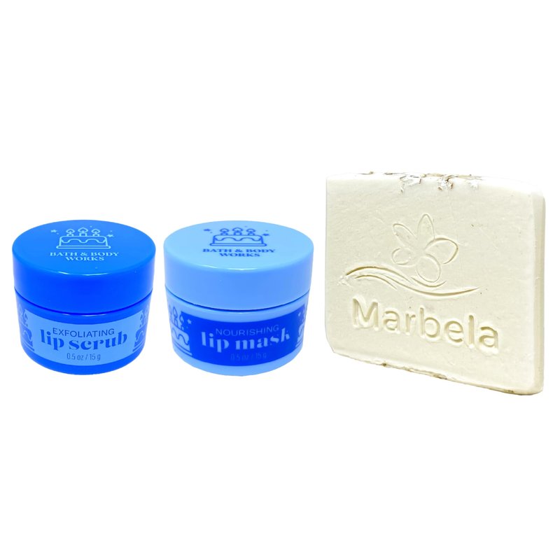 Bath & Body Works Birthday Frosting Lip Scrub and Lip Mask Set with a Marbela Natural oats Sample Soap. (Ingredients: Saponified Oils of: Olive Oil, Organic Virgin Coconut Oil, Shea Butter, Sweet Almond Oil, Castor Oil, Vitamin E, Oats. This soap is UNSCENTED in order to be sensitive skin friendly).