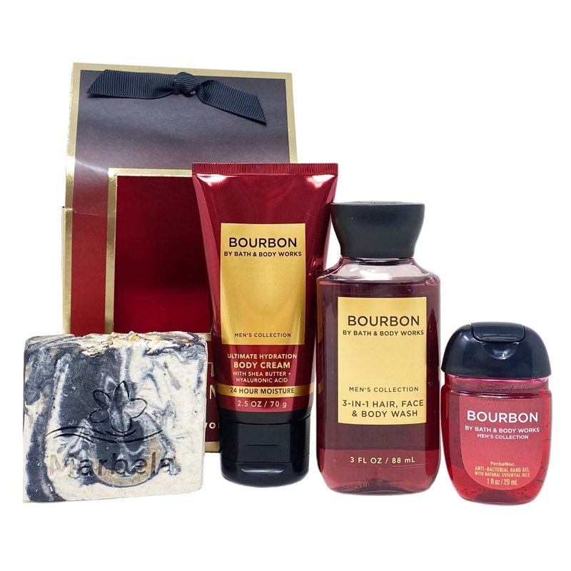 Bath & Body Works Bourbon Here's To Good Times Travel Gift Bag Set - Body Cream - 3-in-1 Hair, Face, & Body Wash - Hand Gel - and a Charcoal Scrub Bar Soap - Travel Size