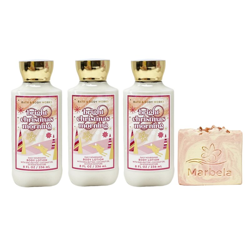 - Bath & Body Works Bright Christmas Morning Daily Nourishing Body Lotion Set with a Marbela Himalayan Salts Springs Bar Soap.