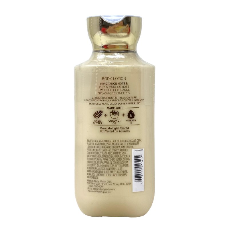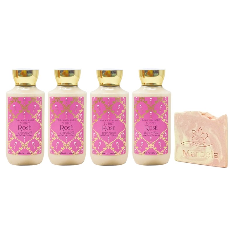 Bath & Body Works Bubbly Rose 24 Hour Moisture Body Lotion Set with a Marbela Himalayan Salts Springs Sample Soap. INCLUDES: 4 24 Hour Moisture Body Lotions (8 fl oz / 236 mL each) and a Marbela Himalayan Salts Springs Sample Soap (Soap May Vary). Bubbly Rose - What it smells like: a sweet, bubbly, celebratory sip. Fragrance notes: pink sparkling rosé sweet blood orange and splash of cranberry. Marbela Sample Soap - While ordinary soaps dry out your skin, Marbela specializes in all-natural, moisturizing soaps and bath products that will take your self-care routine to the next level. The priority is to create products that are all-natural, vegan, cruelty-free and most importantly, handmade with love.