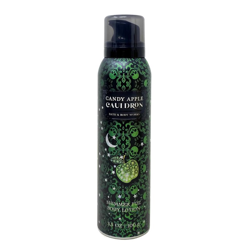 - Bath & Body Works Candy Apple Cauldron Shimmer Fizz Body Lotion Set with a Marbela Natural Oats Sample Soap.