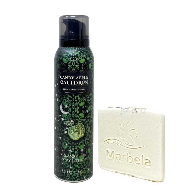Bath & Body Works Candy Apple Cauldron Shimmer Fizz Body Lotion with a Marbela Natural Oats Sample Soap. INCLUDES: 3.5 oz / 100 g Shimmer Fizz Body Lotion and a Marbela Natural Oats Sample Soap (Soap May Vary). Candy Apple Cauldron - What it smells like: sampling a sweet brew freshly concocted by a mystical witch. Fragrance notes: mysterious green apple, simmering sugar and crystalized bergamot. What it does: gives skin a fun, fizzy sensation and a silky soft feeling. Marbela Sample Soap - While ordinary soaps dry out your skin, Marbela specializes in all-natural, moisturizing soaps and bath products that will take your self-care routine to the next level. The priority is to create products that are all-natural, vegan, cruelty-free and most importantly, handmade with love.