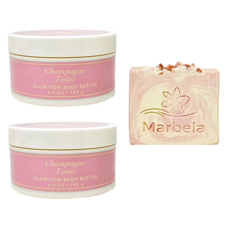 Bath & Body Works Champagne Toast Body Butter Set with a Marbela Himalayan Salts Springs Bar Soap. (Ingredients: Saponified Oils of: Olive Oil, Organic Virgin Coconut Oil, Shea Butter, Castor Oil, Himalayan Salts, Kaolin Clay, Fragrance, Vitamin E, Mica, Litsea Cubeba Essential Oil).