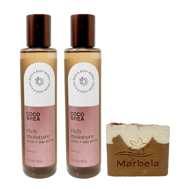 Bath & Body Works Coco Shea Rich Moisture - 2 Pack Of Body Oil With a Marbela Yamma Jamma Bar Soap. (Marbela Soap May Vary)