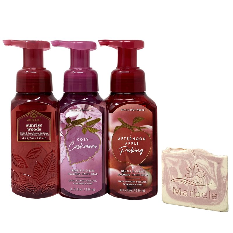 Bath & Body Works Cozy Cashmere, Sunrise Woods, Afternoon Apple Picking Gentle Foaming Hand Soap Pack of 3 With a Himalayan salts Spring Sample Soap.