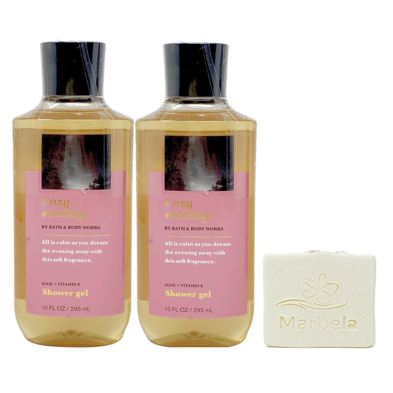 Bath & Body Works Cozy Evening - 2 Pack - Shower Gel Aloe + Vitamin E With a Marbela Natural Oats Sample Soap. (Marbela Sample Soap May Very)