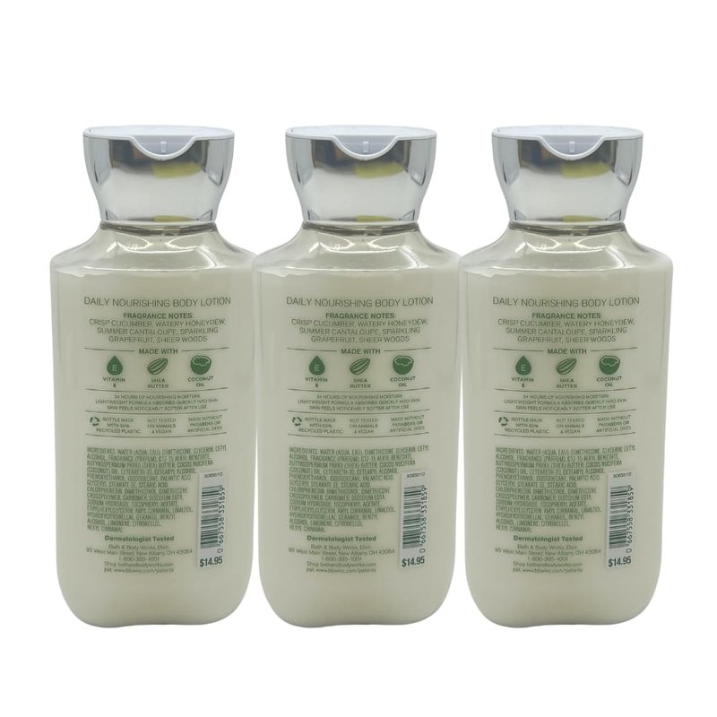 - Bath & Body Works Cucumber Melon Body Lotion - Provides 24-hour nourishing moisture. This lightweight formula absorbs quickly into the skin and the skin feels noticeably softer after use!