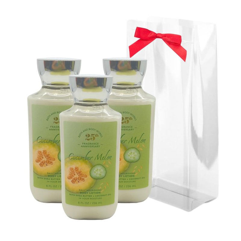Dive into the timeless allure of the Bath & Body Works Cucumber Melon Body Lotion Gift Set - a 25th year anniversary edition. This body lotion offers 24-hour nourishing moisture, ensuring skin feels noticeably softer with its rapid-absorbing formula. Revel in its classic aroma, a harmonious blend of Crisp Cucumber, Watery Honeydew, Summer Cantaloupe, Sparkling Grapefruit, and Sheer Woods. Beautifully comes with a plastic bag and vibrant red bow, it's the perfect gift set for women who appreciate timeless elegance.