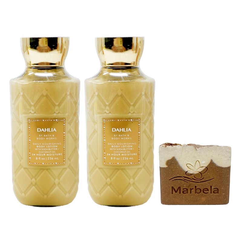 Bath & Body Works Dahlia - 2 Pack Of Daily Nourishing Body Lotion With a Marbela Yamma Jamma Bar Soap. (Marbela Soap May Vary).