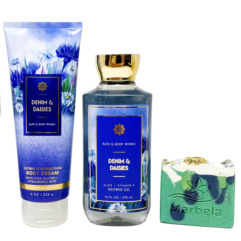 - Bath & Body Works Denim & Daises - Duo Gift Set - Body Cream and Shower Gel with Aloe Vera Soap., blue
