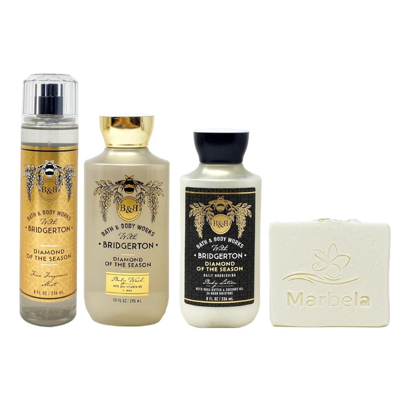 Bath & Body Works Diamond Of The Season Trio Bundle with a Marbela Natural Oats Bar Soap. INCLUDES: 8 fl oz / 236 mL Fine Fragrance Mist, 10 fl oz / 295 mL Body Wash, 8 fl oz / 236 mL Daily Nourishing Body Lotion, and a 4 oz Marbela Natural Oats Bar Soap. Diamond Of The Season - What it smells like: you've captivated and enchanted even your toughest critics. Fragrance notes: sparkling peach, spring daffodil and radiant jasmine. Marbela Natural Oats Soap - Natural Oats is our most gentle formula for any skin type! Oats help to cleanse, exfoliate and soothe irritation. In addition, the sweet almond oil leaves skin soft and pampered. This soap was made for people with sensitive skin because we realize what a battle that can be. Notes of: This soap is UNSCENTED in order to be sensitive skin friendly.