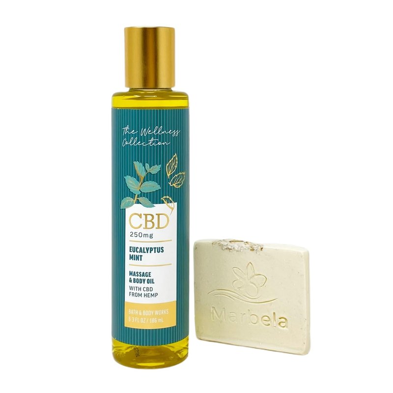 - Bath & Body Works Eucalyptus Mint Massage & Body Oil with a Marbela Natural Oats Sample Soap