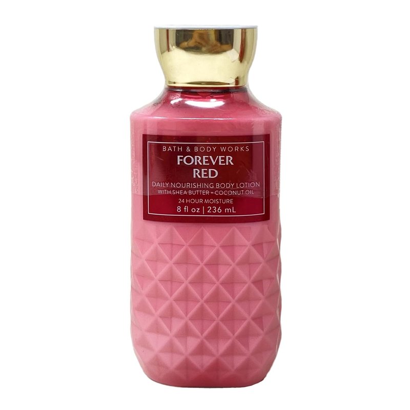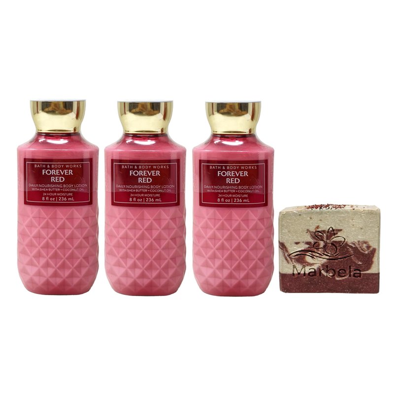Bath & Body Works Forever Red Body Lotion Bundle with a Marbela Cherry On Top Bar Soap. INCLUDES: 3 Daily Nourishing Body Lotions (8 fl oz / 236 mL each) and a 4 oz Marbela Cherry On Top Bar Soap. Forever Red - Fragrance. What it smells like: a passionate, luxurious, unforgettable night. Fragrance notes: fiery pomegranate, red peony, rich vanilla rum and oak wood. Marbela Cherry On Top Bar Soap - Grab a bowl, throw some bananas in the bottom with scoops of your favorite ice cream on top. Drizzle your ice cream with chocolate and caramel sauce and finally save the very best two ingredients for last. Whip cream dollops on top of the ice cream tower and add the cherries right on top. Scent: Cherry, Vanilla, Strawberry.