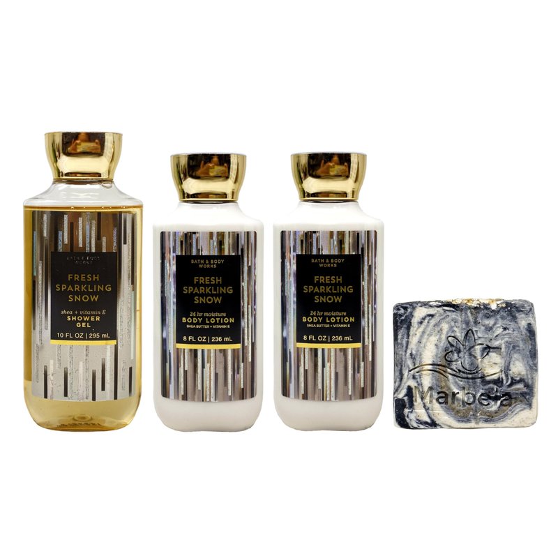 Bath & Body Works Fresh Sparkling Snow 3 Piece Bundle with a Marbela Charcoal Scrub Bar Soap. INCLUDES: INCLUDES: 10 fl oz / 295 mL Shower Gel, 2 24 Hour Moisture Body Lotions (8 fl oz / 236 mL each) and a 4 oz Marbela Charcoal Scrub Bar Soap. Fresh Sparkling Snow - What it smells like: A walk through the glistening snow pairs so beautifully with a night of endless celebration. Fragrance Notes: Iced Pear, Frozen Melon, Winter Apple, Snowdrop Blossom, Frosted Musk. Marbela Charcoal Scrub Soap - Combine activated charcoal, fresh coffee grounds, and oats for three powerful natural exfoliants. The fine grains throughout the soap in combination with its lack of fragrance exfoliate even the most sensitive skins.In addition, the blended clay and butters of the soap moisturize and soften making the ingredients the perfect duo. Scent: This soap is UNSCENTED in order to be sensitive skin friendly.