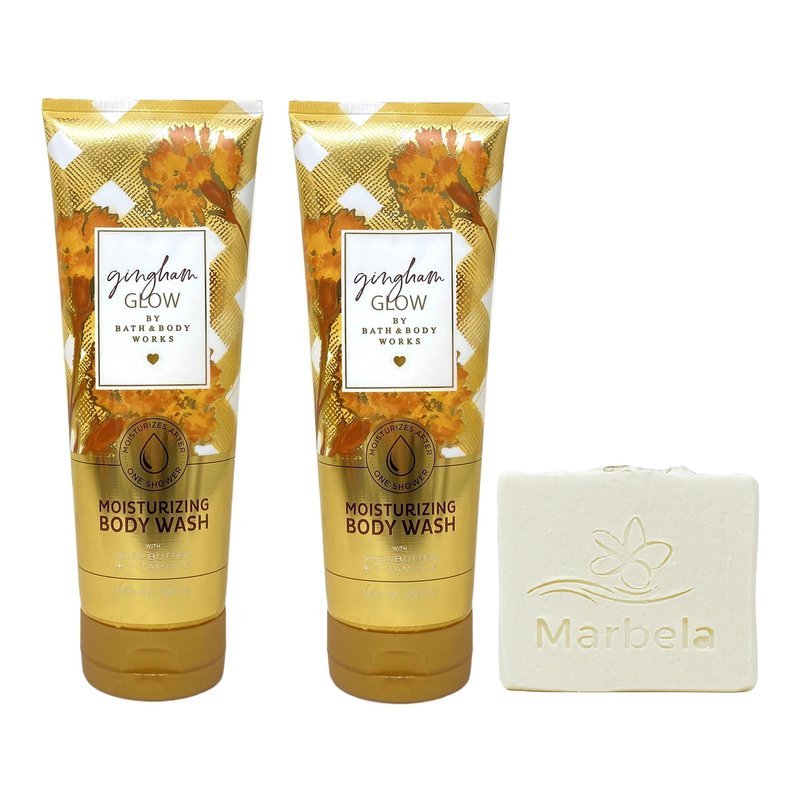 Bath & Body Works Gingham Glow Moisturizing Body Wash Bundle with a Marbela Natural Oats Bar Soap. INCLUDES: 2 Moisturizing Body Washes (10 fl oz / 296 mL each) and a 4 oz Marbela Natural Oats Bar Soap. Gingham Glow - What it smells like: the most joyful, radiant and golden Gingham yet. Fragrance notes: golden nectar, marigold petals and sun-soaked sandalwood. What it does: instantly hydrates and gently cleanses your skin with a rich, creamy lather. Marbela Natural Oats Soap - Natural Oats is our most gentle formula for any skin type! Oats help to cleanse, exfoliate and soothe irritation. In addition, the sweet almond oil leaves skin soft and pampered. This soap was made for people with sensitive skin because we realize what a battle that can be. Notes of: This soap is UNSCENTED in order to be sensitive skin friendly.