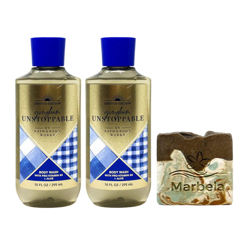 - Bath & Body Works Gingham Unstoppable Body Wash Bundle with a Marbela Cabin Spice Bar Soap.