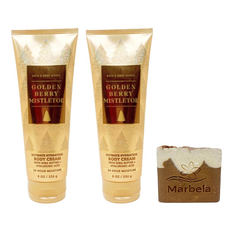 Bath & Body Works Golden Berry Mistletoe - 2 Pack Of Ultimate Hydration Body Cream With a Marbela Yamma Jamma Bar Soap. (Marbela Soap May Vary)
