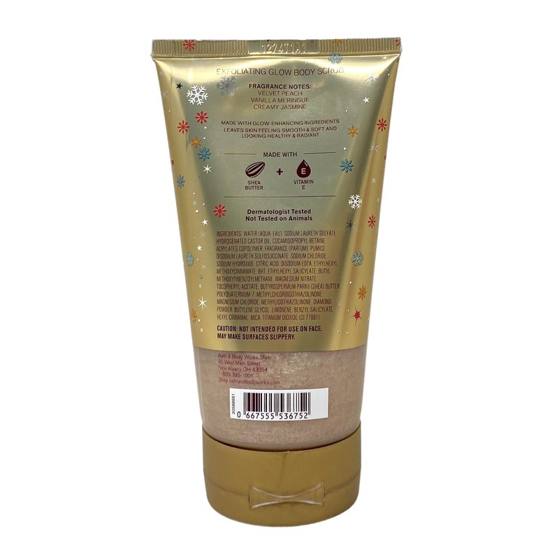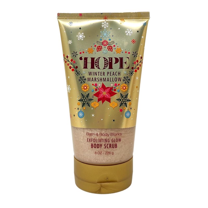 Bath & Body Works HOPE Winter Peach Marshmallow Body Scrub with a Marbela Wild Jasmine Bar Soap. INCLUDES: 8 oz / 226 g Exfoliating Glow Body Scrub and a 4 oz Marbela Wild Jasmine Bar Soap. HOPE Winter Peach Marshmallow - Fragrance Description: A smooth, sweet blend of velvet peach, vanilla meringue and creamy jasmine. Marbela Wild Jasmine Bar Soap - Imagine looking out over a horizon full of fresh wildflowers while you are holding a warm mug of tea.Wild Jasmine soap accomplishes this same feeling of warmth and peace while being a universally attractive scent. Scent: Jasmine, Patchouli, and Apple give a warm yet floral scent to this handmade soap.
