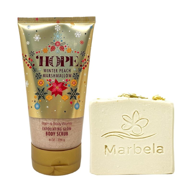 - Bath & Body Works HOPE Winter Peach Marshmallow Body Scrub with a Marbela Wild Jasmine Bar Soap.