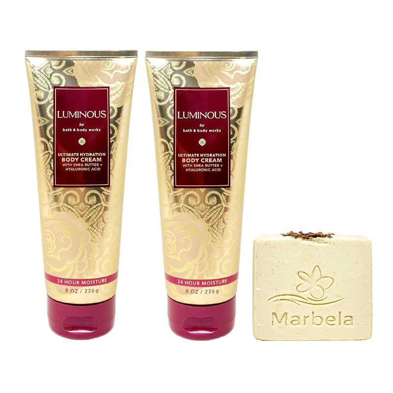 Bath & Body Works Luminous Ultimate Hydration Body Cream Gift Set with a Marbela Creamy Rose Bar Soap. INCLUDES: 2 Ultimate Hydration Body Creams (8 oz / 226 g each) and a 4 oz Marbela Creamy Rose Bar Soap. Luminous - What it smells like: radiant, decadent and sparkling. Marbela Creamy Rose Bar Soap - You have come to the right place. Roses and oats combine to create a sweet and delicate scrub that works to gently exfoliate.The creaminess of the soap dually moisturizes and smoothens. Scent: Gentle Roses and Ylang Ylang Essential Oil.