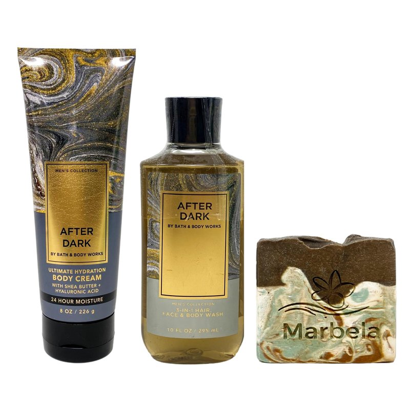 Bath & Body Works Men's Collection After Dark Duo Bundle with a Marbela Cabin Spice Bar Soap. INCLUDES: 8 oz / 226 g Ultimate Hydration Body Cream, 10 fl oz / 295 mL 3-in-1 Hair, Face & Body Wash, and a 4 oz Marbela Cabin Spice Bar Soap. After Dark - What it smells like: the citrusy, warm, velvety accessory your night-out wardrobe needs. Fragrance notes: spiced bergamot, amber and smooth tonka. Marbela Cabin Spice Soap - Imagine being cozied up next to a bonfire, cooking over the fire, and smelling the smoke all through the air. There are few things that feel quite like fall in the same way a bonfire does. Cabin Spice is the perfect warm scent to last from early fall all the way through the winter. Scent: Tobacco, Patchouli, Bay.