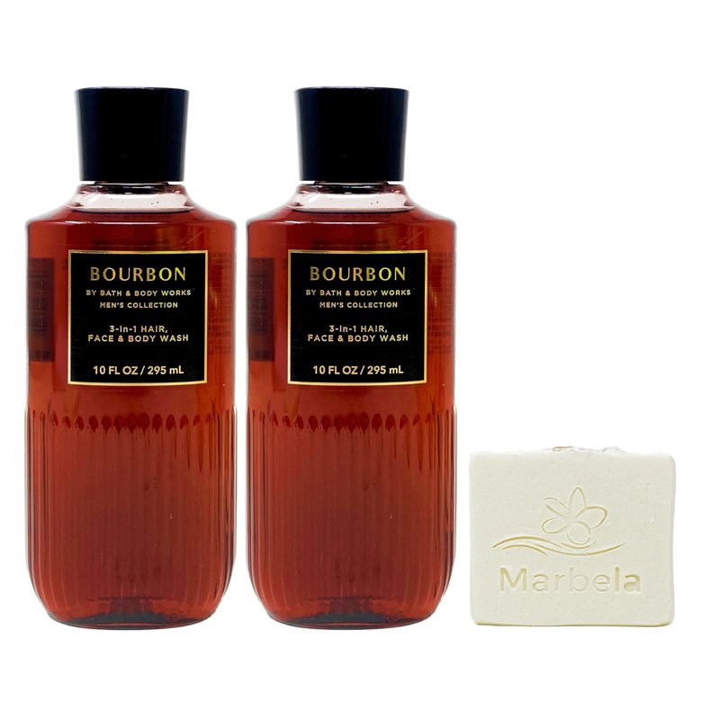 Bath & Body Works Men's Collection Bourbon - 2 pack - Body Wash 3 in 1 Hair, Face & Body Wash With a Marbela Natural Oats Sample Soap. (Marbela Sample Soap May Very)