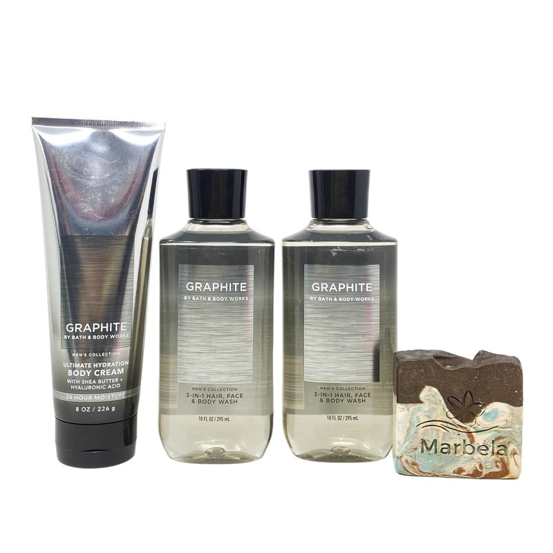 Bath & Body Works Men's Collection GRAPHITE 3 Piece Value Pack with a Marbela Bar Soap. INCLUDES: 8 oz / 226 g Ultimate Hydration Body Cream, 2 3-in-1 Hair, Face & Body Washes (10 fl oz / 295 mL each), and a 4 oz Marbela Bar Soap (Soap May Vary). Graphite - What it smells like: a bold, invigorating rock climbing expedition. Fragrance notes: sage, bergamot and leather woods. Marbela Bar Soap - While ordinary soaps dry out your skin, Marbela specializes in all-natural, moisturizing soaps that will take your self-care routine to the next level. The priority is to create soaps that are all-natural, vegan, cruelty-free and most importantly, handmade with love.