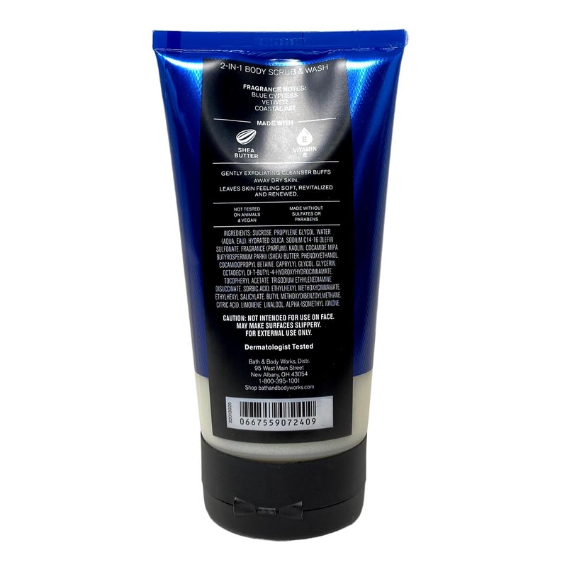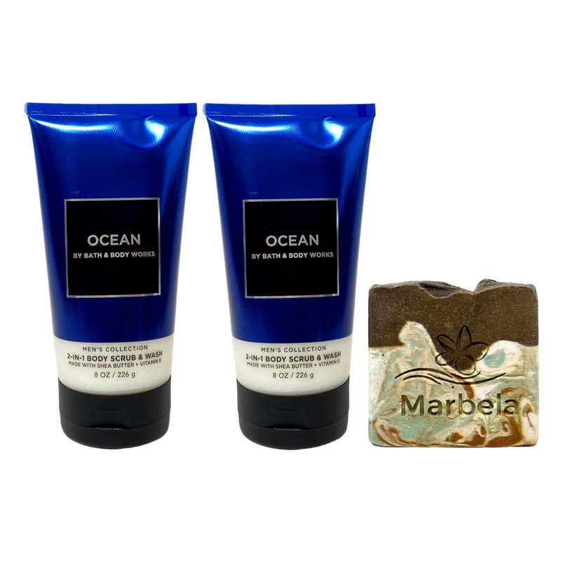 Bath & Body Works Men's Collection Ocean 2-in-1 Body Scrub & Wash Gift Set with a Marbela Cabin Spice Bar Soap. INCLUDES: 2 2-in-1 Body Scrub & Washes (8 oz / 226 g each) and a 4 oz Marbela Cabin Spice Bar Soap. Ocean - What it smells like: a cool, refreshing dip in the deep blue sea. Fragrance notes: blue cypress, vetiver and coastal air. What it does: gently buffs away dry skin for a rich, silky skin-smoothing treat. Marbela Cabin Spice Bar Soap - Imagine being cozied up next to a bonfire, cooking over the fire, and smelling the smoke all through the air. There are few things that feel quite like fall in the same way a bonfire does. Cabin Spice is the perfect warm scent to last from early fall all the way through the winter. Scent: Tobacco, Patchouli, Bay.