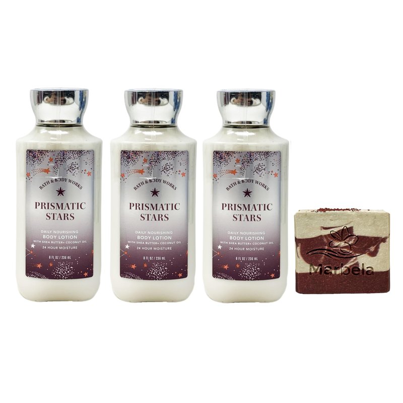 - Bath & Body Works Prismatic Stars Daily Nourishing Body Lotion Gift Set with a 4 oz Marbela Cherry On Top Bar Soap. (Soap May Vary).