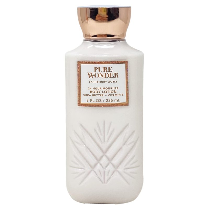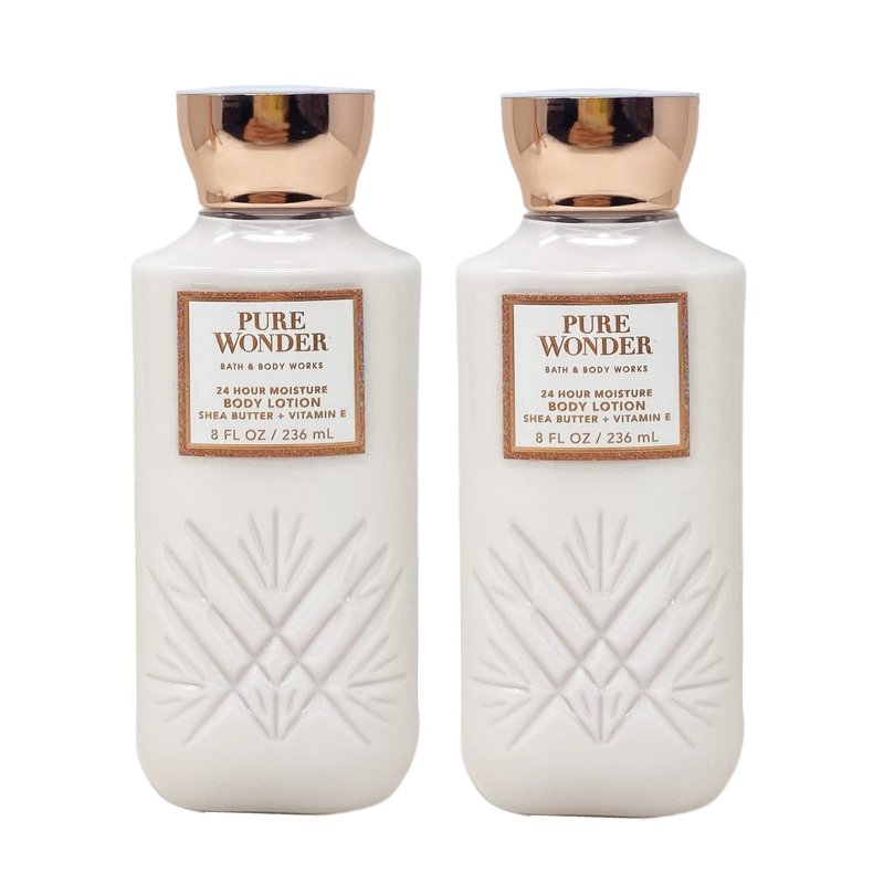 Bath & Body Works Pure Wonder - Set Includes: 2 Daily Nourishing Body Lotions (8 fl oz / 236 mL each). What it smells like: a dreamy, warm, joyfully bright delight. Fragrance notes: iced rosé, star jasmine and warm white amber. What it does: provides 24 hours of nourishing moisture and leaves skin feeling noticeably softer after one use. Lightweight texture absorbs quickly.