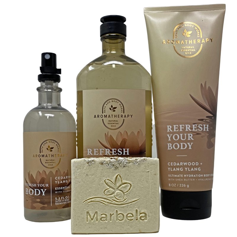 Bath & Body Works Refresh Your Body Aromatherapy Cedarwood and Ylang Ylang Gift Set - Body Cream - Body Wash - Essential Oil Mist Includes an Marbela Artisan Bar Soap Natural Oats - Full Size
