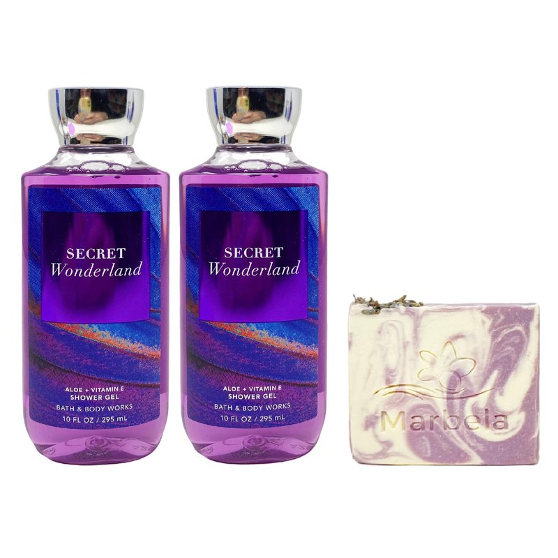Bath & Body Works Secret Wonderland 2 Pack Shower Gel Bundle with a 4 oz Marbela Lavender Dream Bar Soap (Ingredients: Saponified Oils of: Olive Oil, Organic Virgin Coconut Oil, Cocoa Butter, Shea Butter, Castor Oil, Sweet Almond Oil, Dried Lavender, Fragrance, Vitamin E, Kaolin Clay, Mica Essential oils of Cedarwood Atlas, Lavender, Geranium).