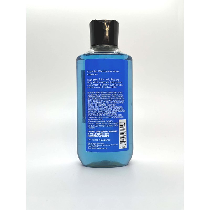 Bath and Body Works Ocean 3-in-1 Hair & Body Wash 10 Oz.. Scent: blue cypress, vetiver and coastal air.. Ingredients: (vitamin E, shea butter and aloe) Dermatologist tested (Bottle Design May Vary)