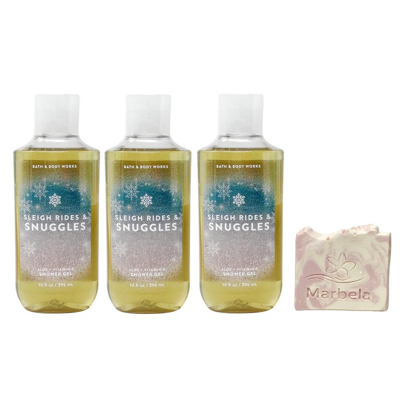 Bath & Body Works Sleigh Rides & Snuggles - 3 Pack Of Shower Gel Aloe + Vitamin E With a Marbela Himalayan Salts Springs Sample Soap. (Marbela Sample Soap May Vary).