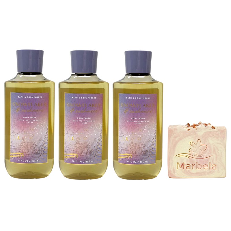 - Bath & Body Works Snowflakes & Cashmere Body Wash Bundle with a 4 oz Marbela Himalayan Salts Springs Bar Soap.(Soap May Vary).